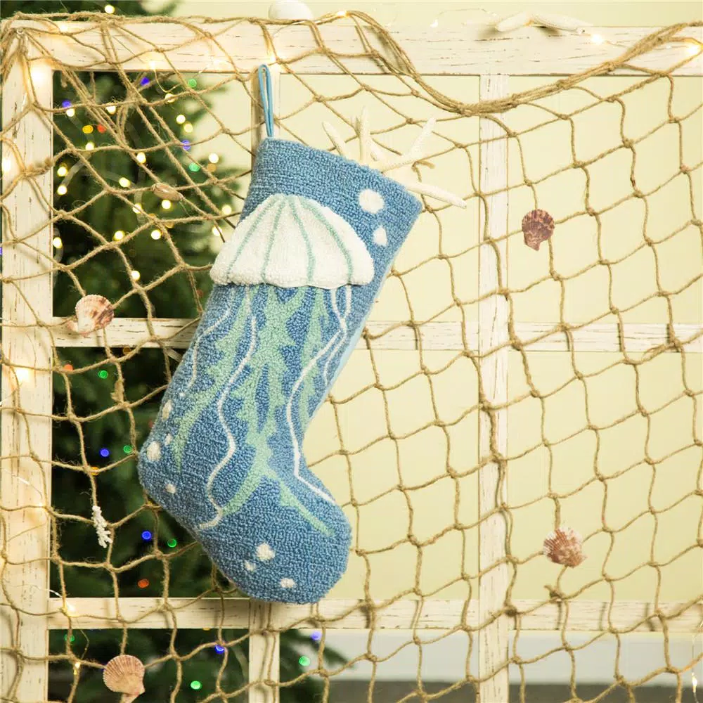 Celebrating Christmas by the ocean or are you wishing you were. Bring the beach to your home with this beach themed stocking. Featuring a jelly fish coving the full length of the stocking, this holiday decor will add a unique flair to your home this Christmas season.