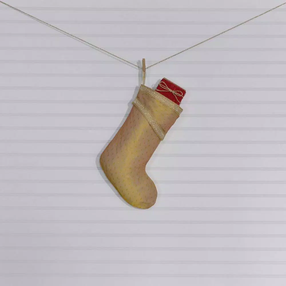 The Tinsel Stocking is an elegant statement for Christmas morning. Features shimmery gold tulle (fine netting) overlaid on an antique white cotton woven with a shimmery gold thread pattern. The slanted cuff is embellished with gold vine trim on both the top and bottom to complete the look.